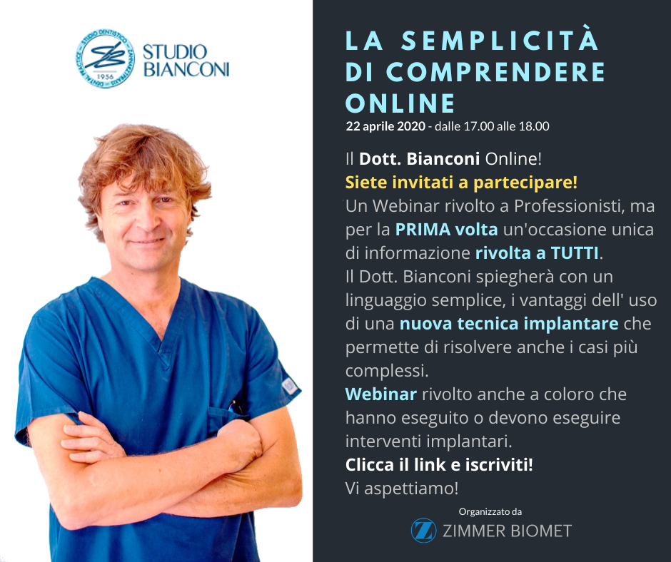 La semplicità di comprendere ONLINE! Il Dott. Bianconi, 32 anni di esperienza nel campo della chirurgia implantare, il 22 Aprile dalle ore 17.00 alle 18.00, spiegherà con un linguaggio semplice i vantaggi dell’uso di una nuova tecnica che permette di…