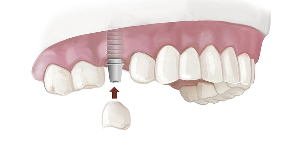 Nach drei Wochen wird die Heilschraube entfernt und der Abutment (Bestandteil welches an das Implantat geschraubt wird, den Zahn stützt und dessen Innenseite bildet), damit ein Abdruck zustande kommen kann, mit dem die Prothese erstellt und montiert wird (spätbelastetes Implantat).