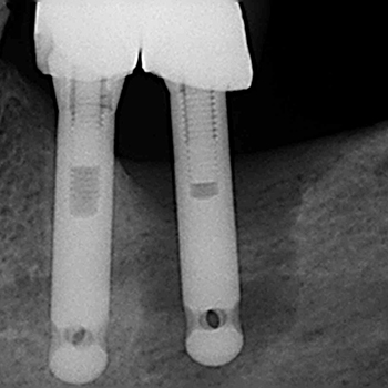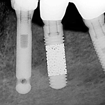 Si noti l’area più scura attorno all’impianto che corrisponde al riassorbimento osseo. Si noti nella seconda foto la scomparsa dell’alone ed il ripristino del corretto volume osseo.